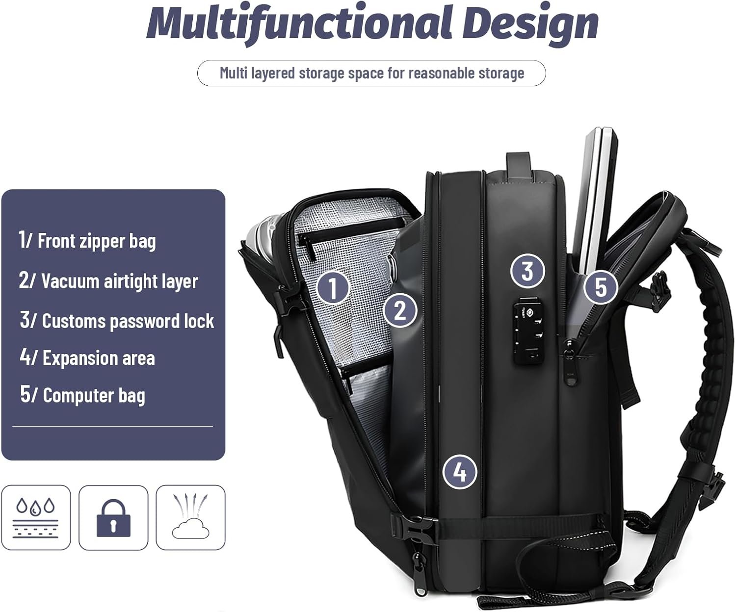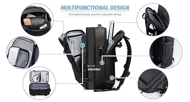 Multiple compartments for organized storage, including space for a laptop;