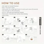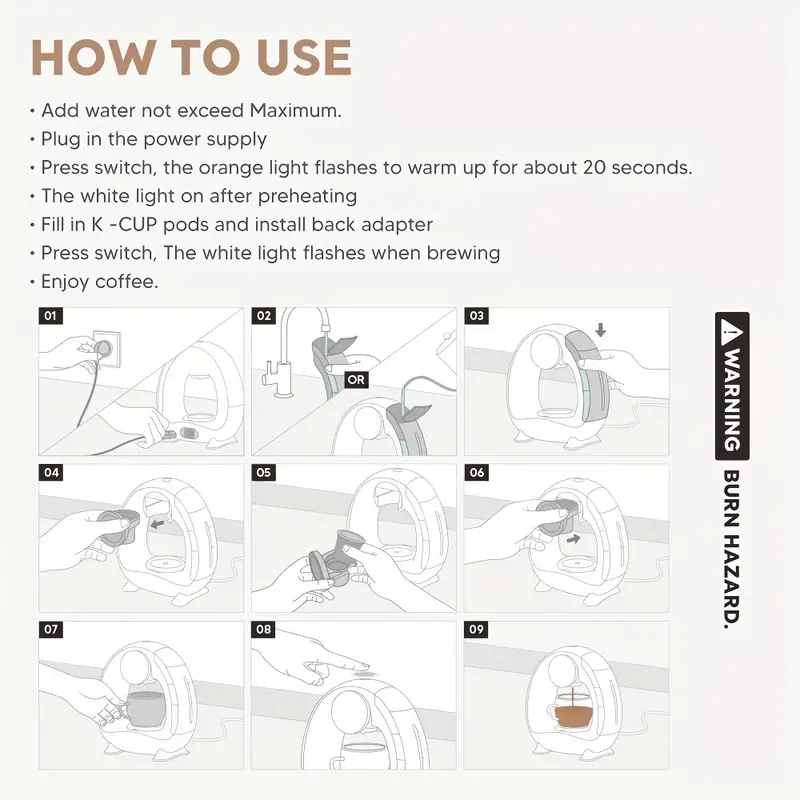 Instructions for use: Connect the power supply. Pour water without exceeding the maximum level. Press the switch; the orange light will flash to warm up for approximately 20 seconds. The white light will turn on after preheating. Fill Disposable K-Cups and reattach the adapter. Press the switch; the white light will flash during brewing. Enjoy your coffee.