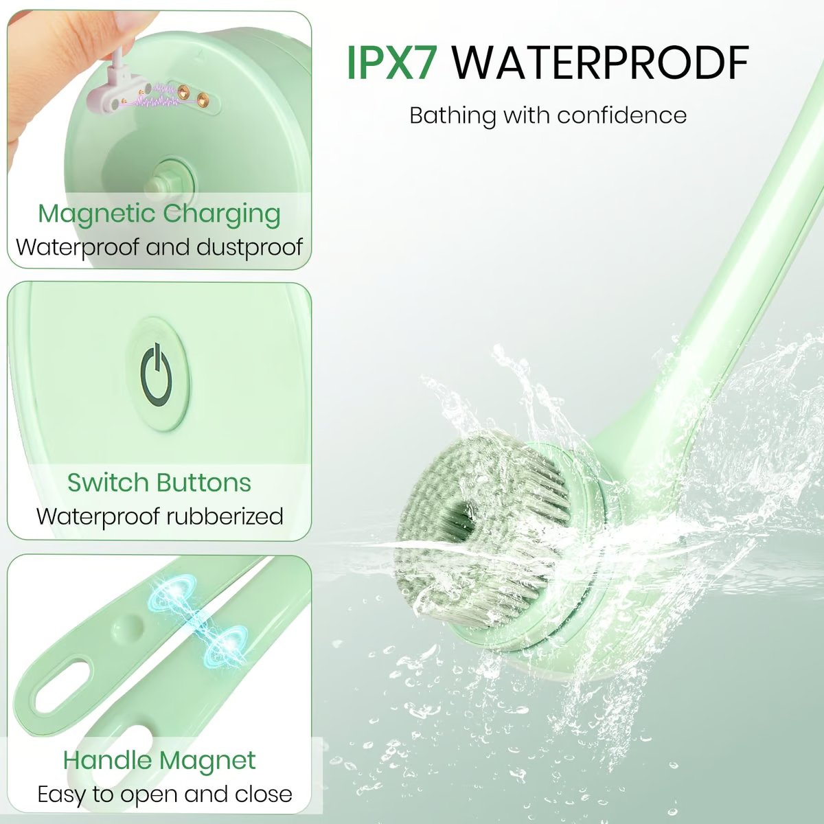 Double Handles Design: This electric shower brush features a dual-handle design to help you reach your back and other hard-to-reach places. The single and double handles can be switched freely for convenient use in the shower, meeting all your bathing needs.