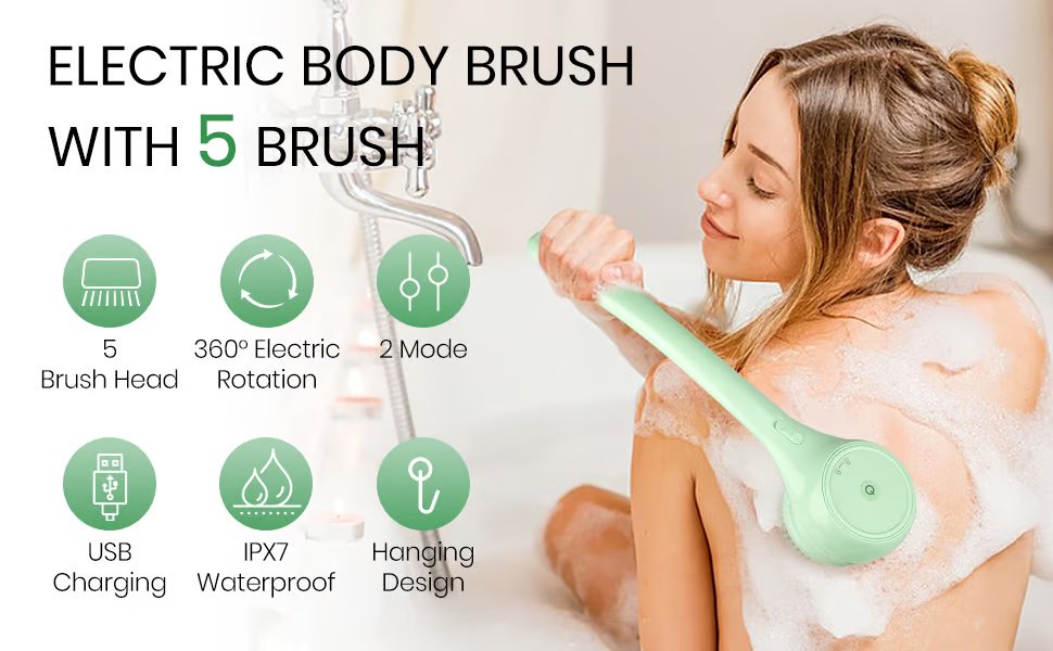 Meet Different Needs: The electric body bath brush is equipped with 5 bath brush heads with different functions: soft bristle cleaning brush head, bath brush head, massage head, scrubbing head, and exfoliating head. This bath brush is perfect for removing dead skin cells, oil, and stains, as well as relaxing and soothing your entire body.