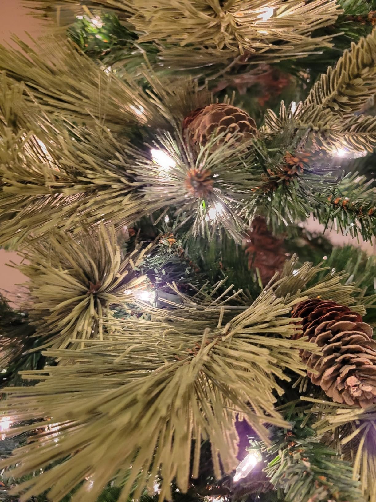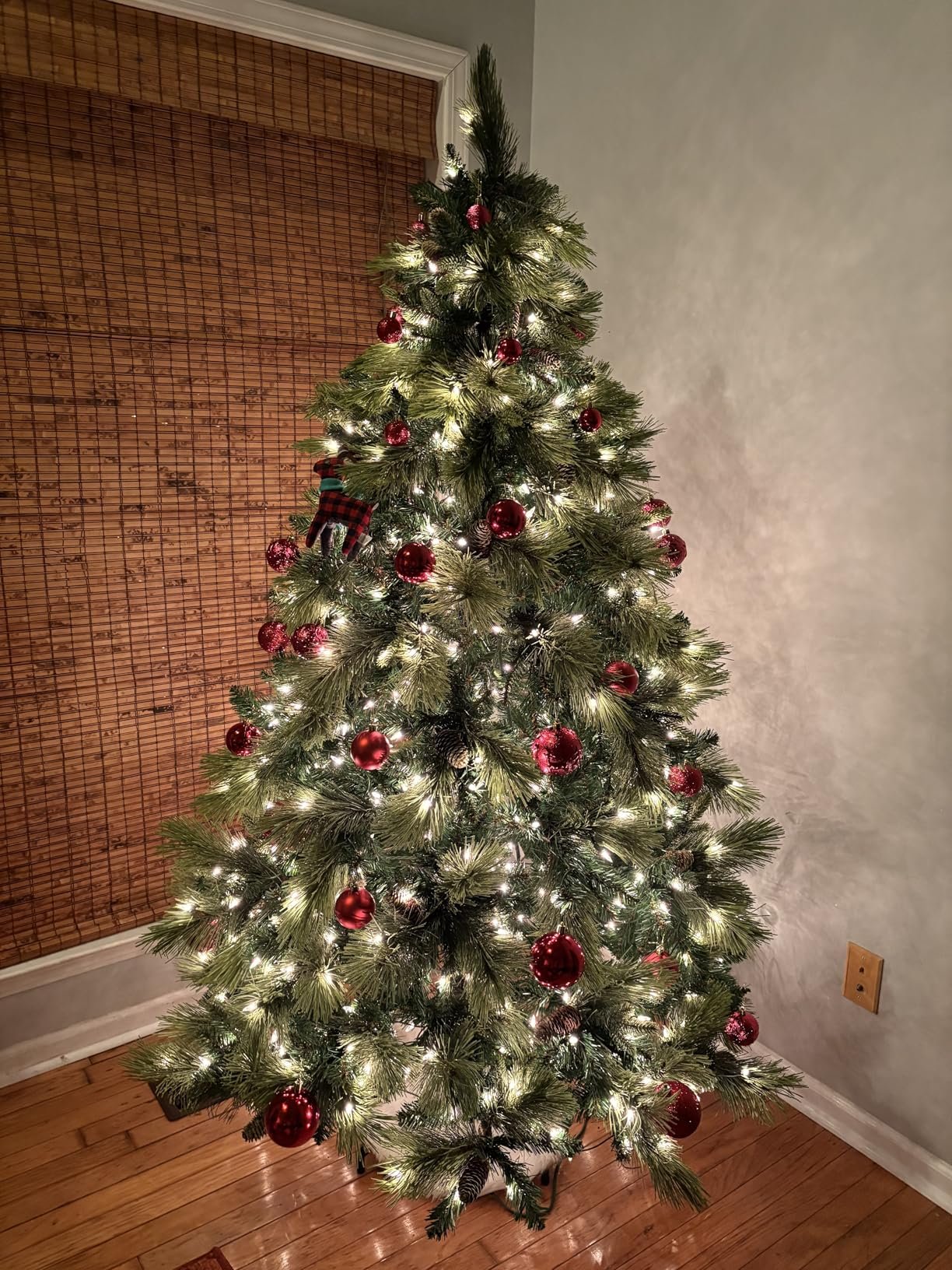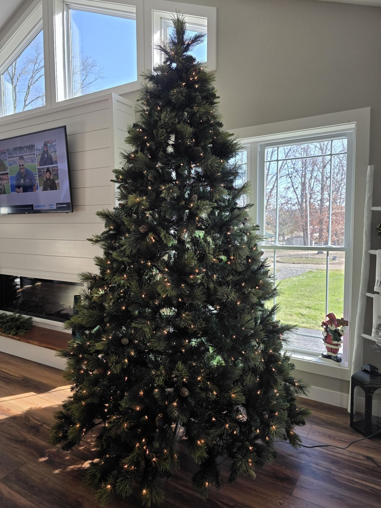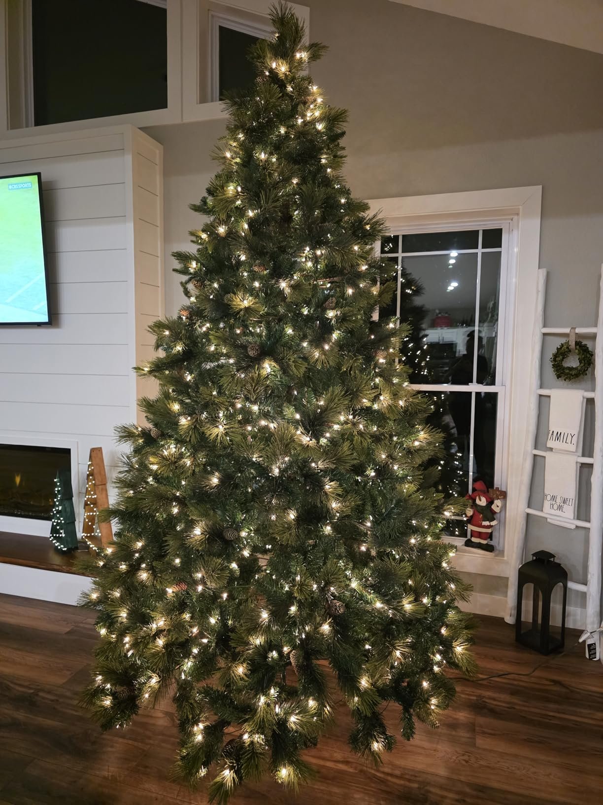 Plenty LED bulbs per branch, sturdy and easy set up. Effortless fluffing, thick. beautiful and natural shape, 2 colored and sizes pine and the soft foam made pine cones are in perfect harmony!!!