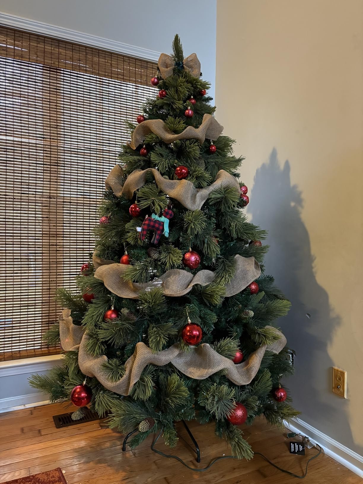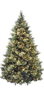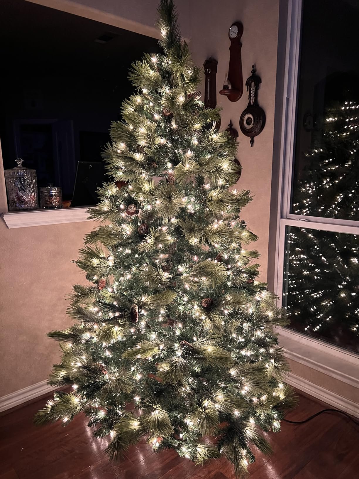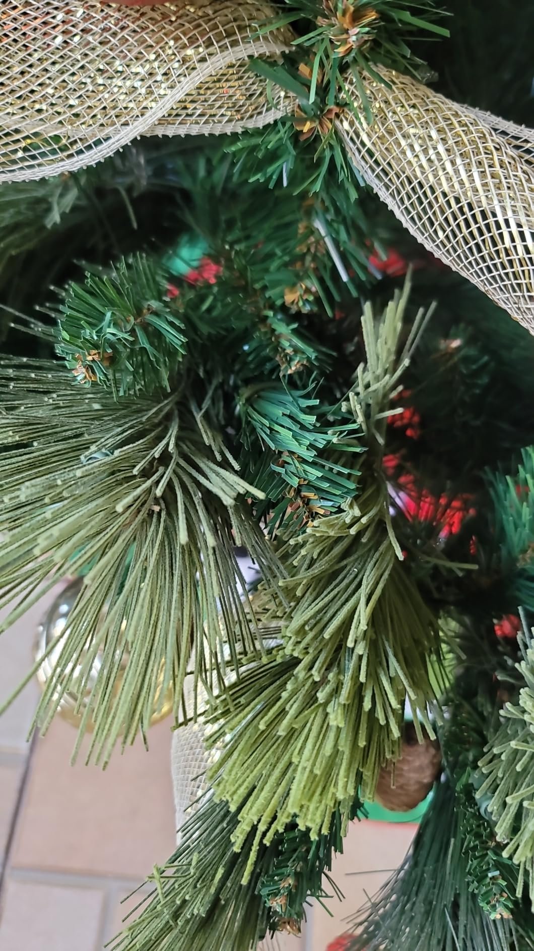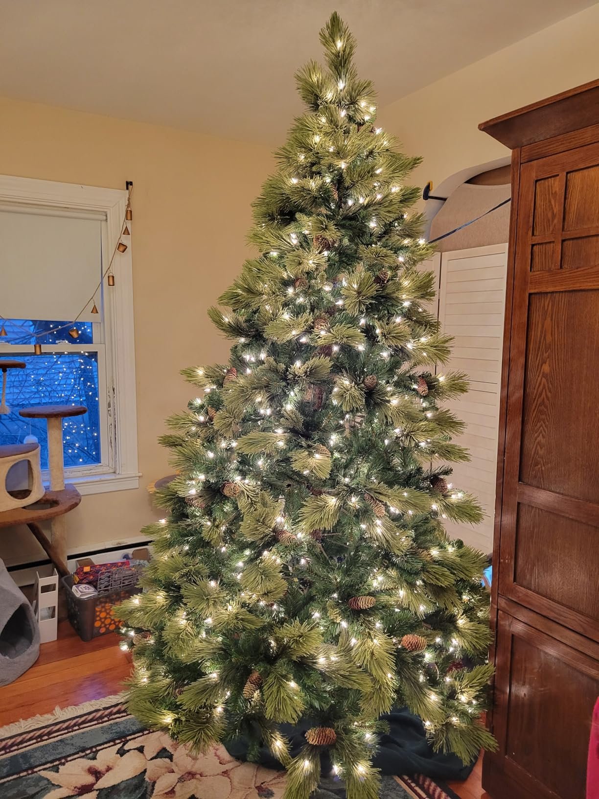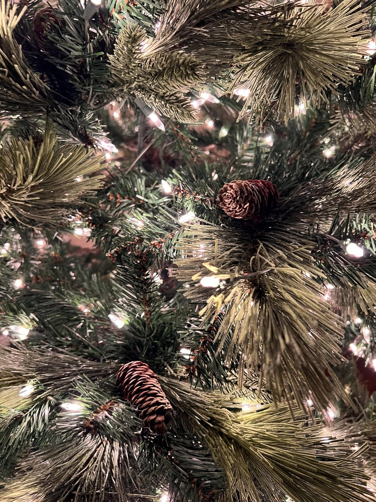 Plenty LED bulbs per branch, sturdy and easy set up. Effortless fluffing, thick. beautiful and natural shape, 2 colored and sizes pine and the soft foam made pine cones are in perfect harmony!!!