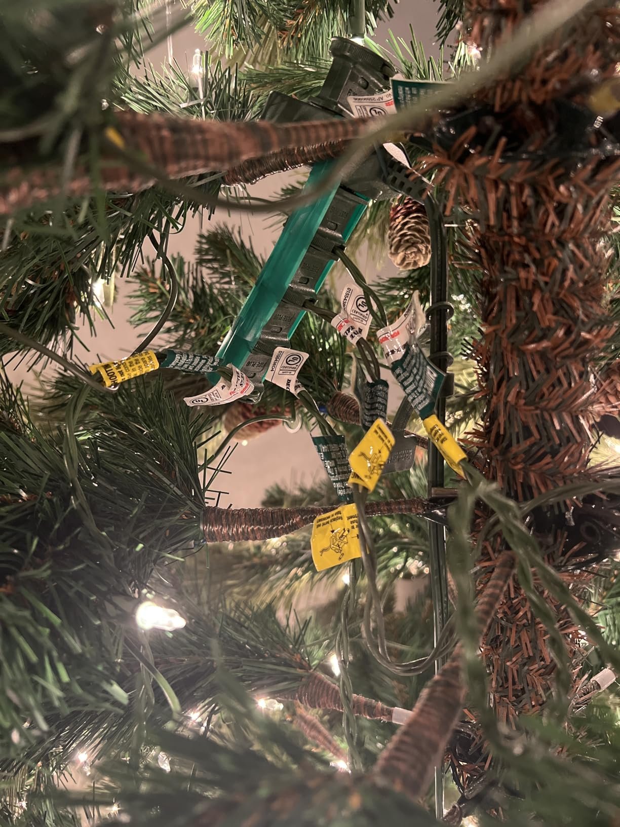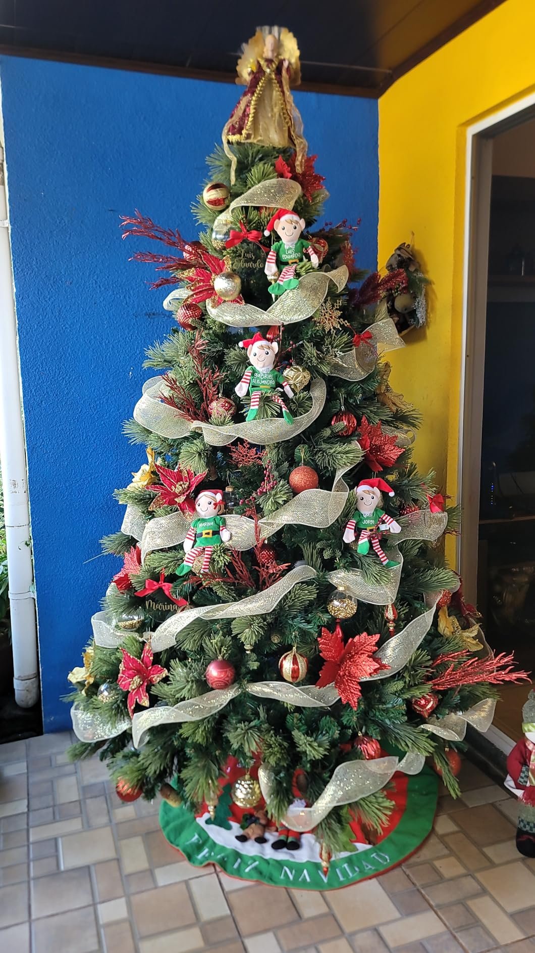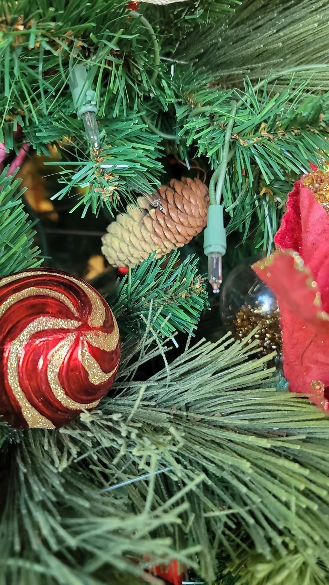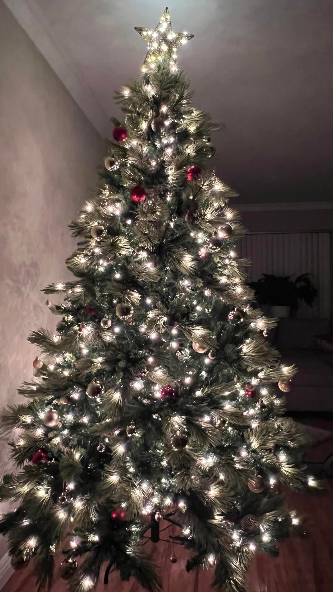 Plenty LED bulbs per branch, sturdy and easy set up. Effortless fluffing, thick. beautiful and natural shape, 2 colored and sizes pine and the soft foam made pine cones are in perfect harmony!!!